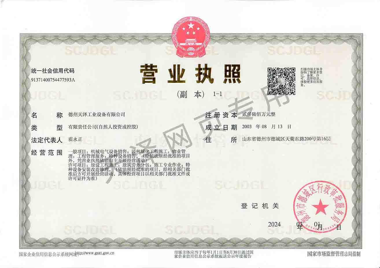 德州天澤工業設備有限公司成立于2003年(前身為德州天元集團天明工業設備安裝公司),經過20多年的發展,現成長為擁有職工600余人,各類專業技術人員近300余人,年生產能力兩億元以上,以建筑機電安裝工程、消防設施安裝工程施工為主,集建筑工程施工、市政工程施工、建筑智能化工程施工、園林綠化工程施工、工程管理服務、物業管理、電氣機械設備銷售等多元化經營于一體的綜合型企業。2005年,企業按照國際標準建立的質量管理體系,通過了ISO質量管理體系認證、環境管理體系認證、職業健康安全管理體系認證。施工工程遍布山東、河北、四川、江蘇等地,最具代表性的工程有:山東省德州市百腦匯資訊廣場機電安裝工程、德州經濟開發區天元大廈機電安裝工程、陵城區人民醫院機電安裝工程、德州金魯班大廈機電安裝工程、河北故城金辰小區機電安裝工程、北川地震災后援建工程等。多年來,公司始終堅持“以人為本,建精品工程,創行業品牌”的經營理念,先后榮獲。ㄊ校┘壧┥奖⑻旄Ⅳ敯脖泉勴,申報各種功法、多項專利。